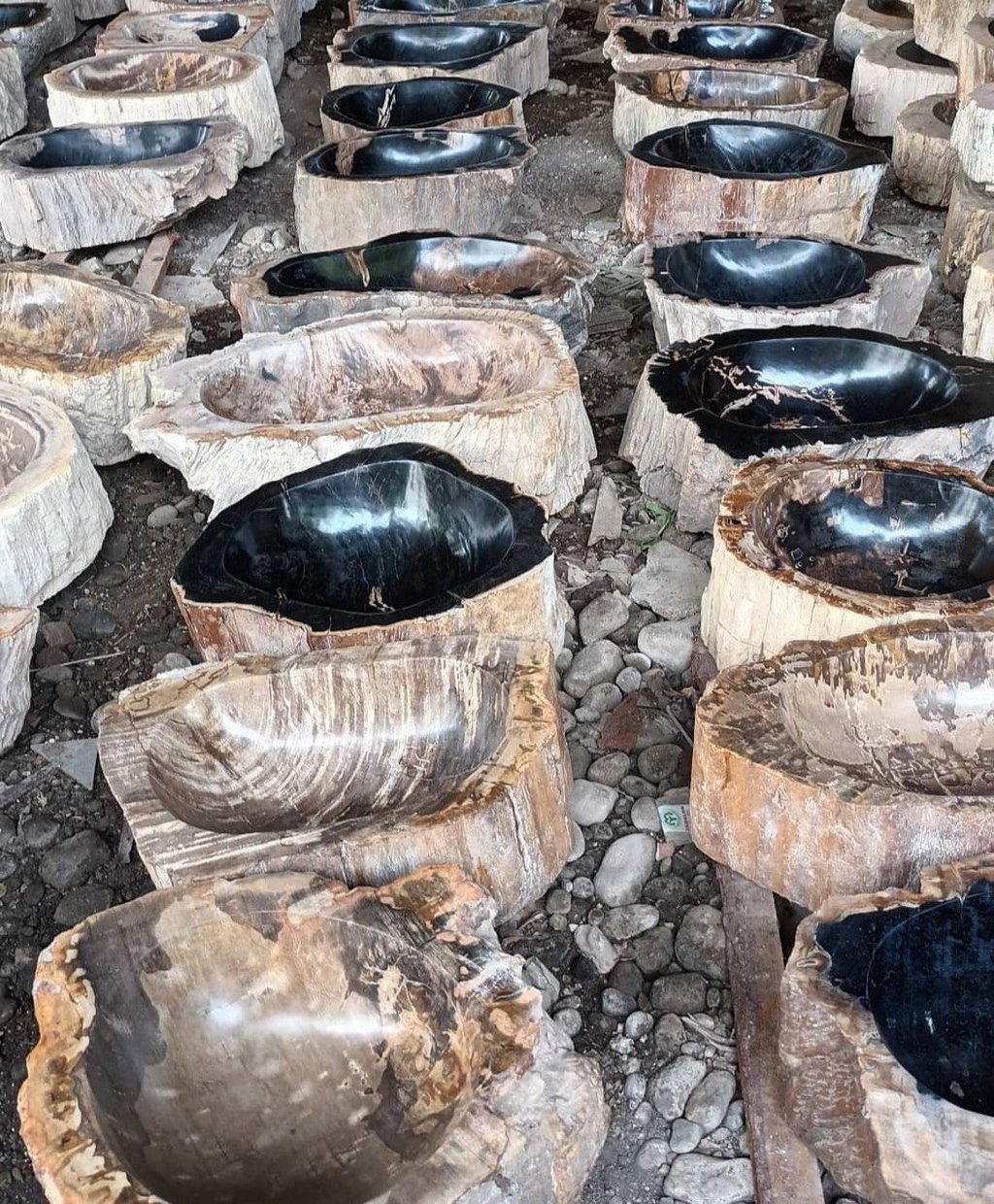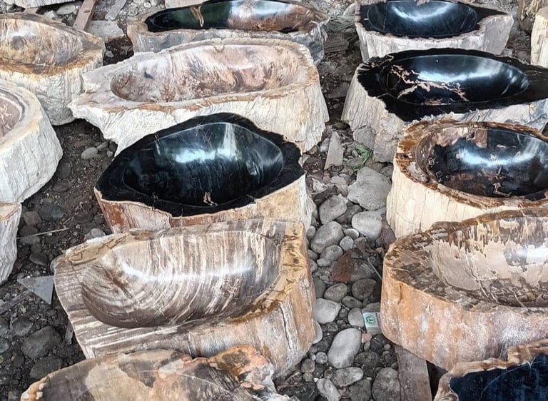Fossil stone sinks handcrafted in Jepara, Indonesia — currently in production and prepared for shipment to the United States.