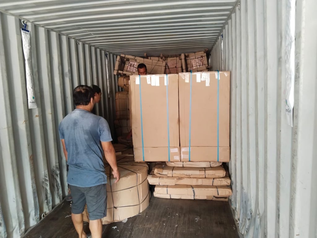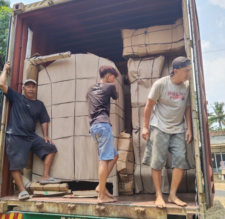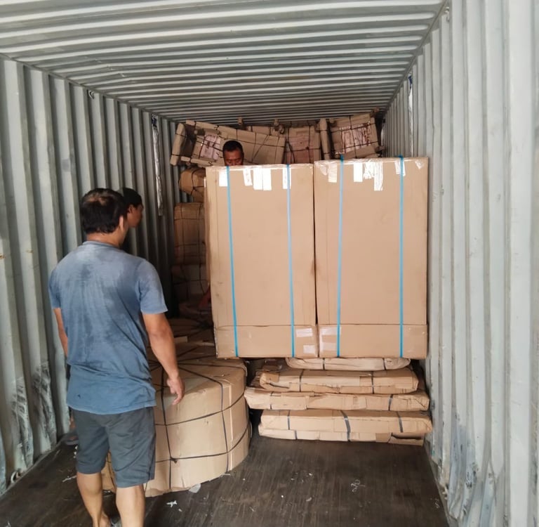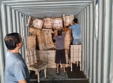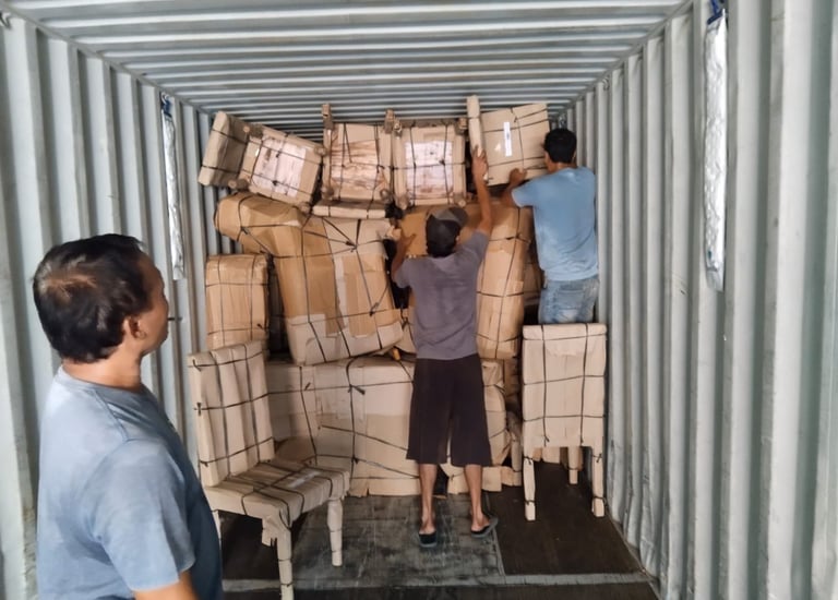 Expertly crafted teak furniture from Jepara, Indonesia, now being carefully loaded and ready to begin its journey to the USA.
